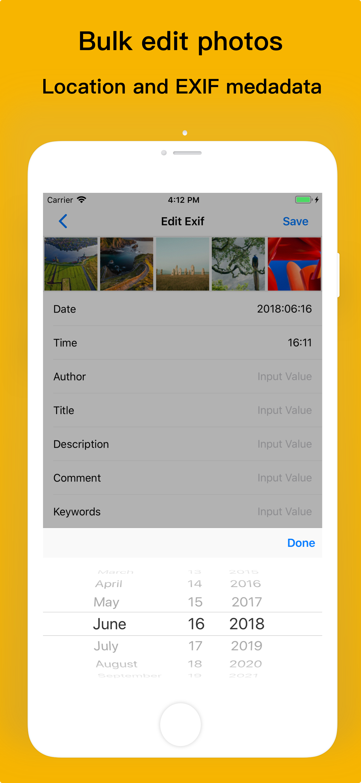 - Edit all the exif metadata, such as data, time, author, title, description, comment, keywords, copyright,camera maker,camera model, aperture, exposure and a lot more